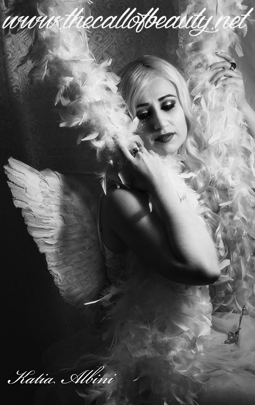 Per la mia trasformazione in un'eterea creatura io e Katia abbiamo usato le ali bianche che abbiamo da anni (le hai viste anche in Pierrot!), 'rapito' i boa di piume bianchi che mia madre usa a Natale per decorare il suo albero e fare un trucco fuori dagli schemi.